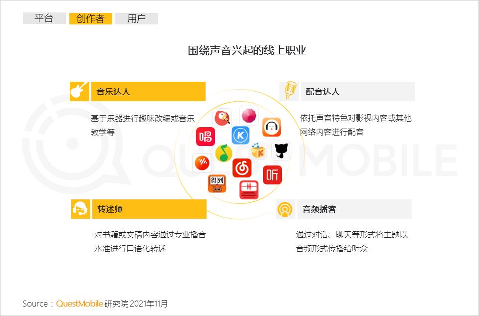 2、声音经济的快速发展,催生各类新兴声音职业,成为音频内容平台的重要供给