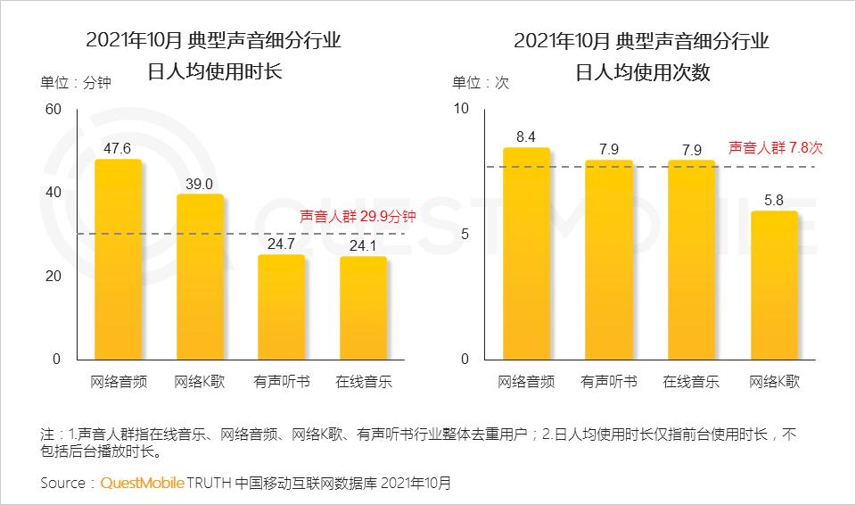 今天Mr.QM跟大家分享一下“声音经济”洞察报告。QuestMobile数据显示,2021年10月,声音人群规模达到7.28亿,其中,在线音乐、网络音频、网络K歌、有声听书月活用户分别为6.63亿、1.20亿、1.14亿、0.38亿,产业链已经相对完整,尤其是网络音频领域,日均用户时长和次数均位居首位,分别达到47.6分钟、8.4次,这也显示出,音频内容已经成为内容经济的重要组成部分。