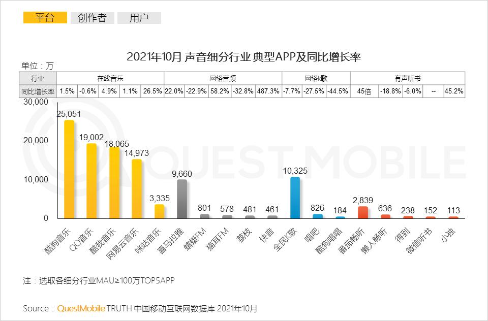 具体到不同领域的用户画像来看,在线音乐年轻用户为主,网络K歌主要为女性,有声听书以中老年为主,网络音频相对均衡。不同内容形式与不同的用户定位相结合,形成了不同的产业结构,例如,在线音乐经过多年发展,行业相对平稳,酷狗音乐、QQ音乐、酷我音乐、网易云音乐10月MAU分别为2.51亿、1.90亿、1.81亿、1.50亿;不过,网络音频、网络K歌、有声听书,相对呈现出头部领先的局面,例如,网络音频领域,喜马拉雅10月MAU 9,660万,蜻蜓FM(MAU 801万)、猫耳FM(MAU 578万)。