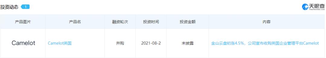 据天眼查APP显示,金山云于2021年8月2日对Camelot进行了并购,并购之后金山云盘初涨4.5%。
