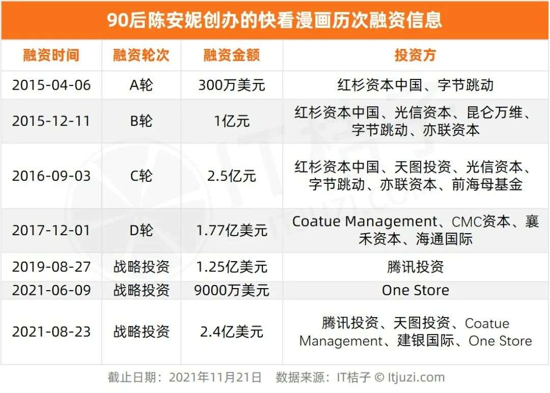 上述那篇漫画成为「开门红」,也为快看漫画撬开了资本的大门,赢得了红杉资本中国、字节跳动的 300 万美元 A 轮融资。2015 年到 2016 年,红杉中国三次持续投资快看漫画。这期间,快看漫画飞速发展。2019 年,腾讯投资快看漫画。2021 年 8 月,快看漫画获得 2.4 亿美元融资,腾讯追加投资,这是快看漫画创办 7 年以来获得的第 7 轮融资。现在快看漫画已有 IPO 计划。