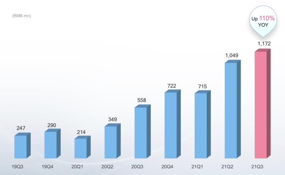 比如哔哩哔哩(以下简称B站),从去年二季度开始,B站广告收入开始翻倍增长。三季度B站广告收入达11.72亿元,同比增速为110.21%,这也是所有可比公司里唯一增速在三位数的。