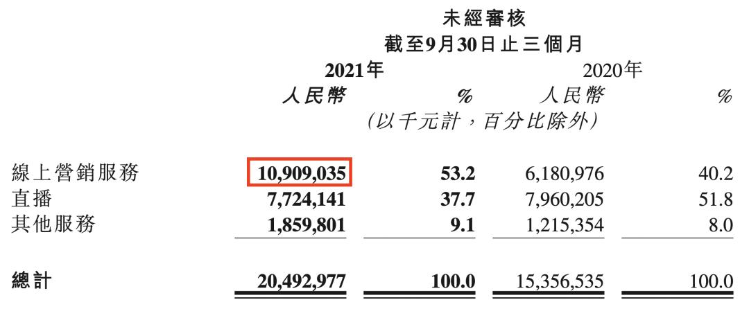 快手2021年Q3线上营销服务收入情况 图源财报