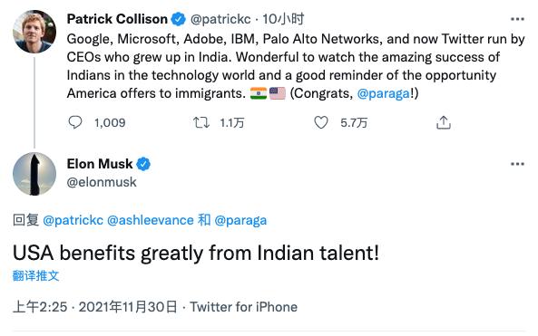 特斯拉CEO埃隆·马斯克(Elon Musk)对此回复称:“印度人才令美国受益匪浅。”