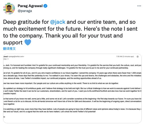 阿格拉瓦尔已在Twitter工作十年,是一名资深高管,也是创始人多西的亲信。他在周一发布推文称,十分感谢多西和整个公司团队,自己对未来感到激动不已,谢谢大家的信任和支持。