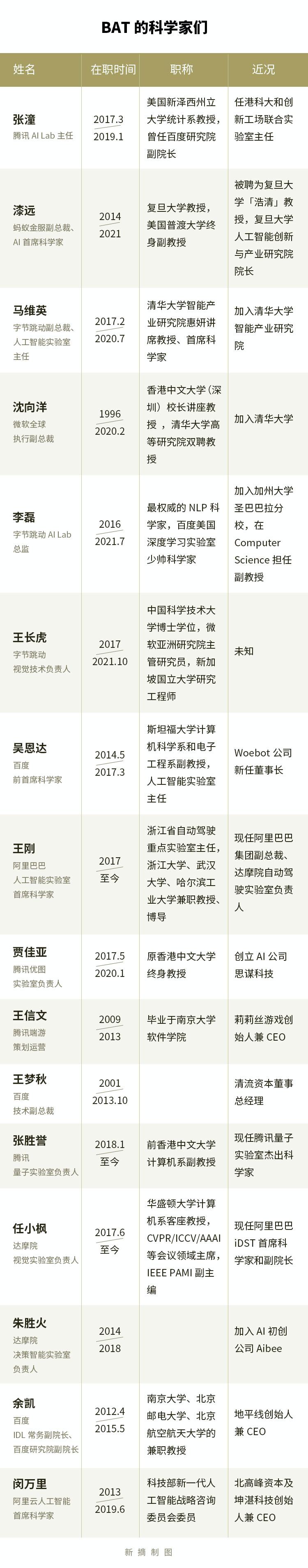 马维英在字节跳动担任副总裁兼人工智能实验室主任,补充字节的AI实力;漆远2014年回国担任阿里巴巴副总裁,2015创建并统领了蚂蚁金服人工智能团队;吴恩达2014年被百度任命为首席科学家,全面负责百度研究院,尤其是Baidu Brain计划……