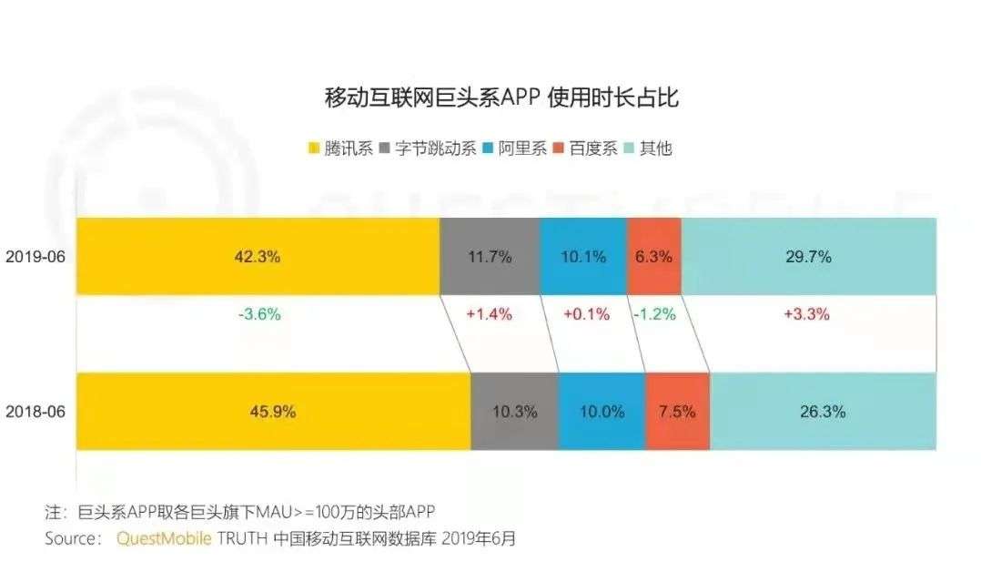 凭借短视频,字节跳动不断抢占互联网用户的时长。2019年6月,字节跳动系APP的移动互联网使用时长占比达到11.7%。