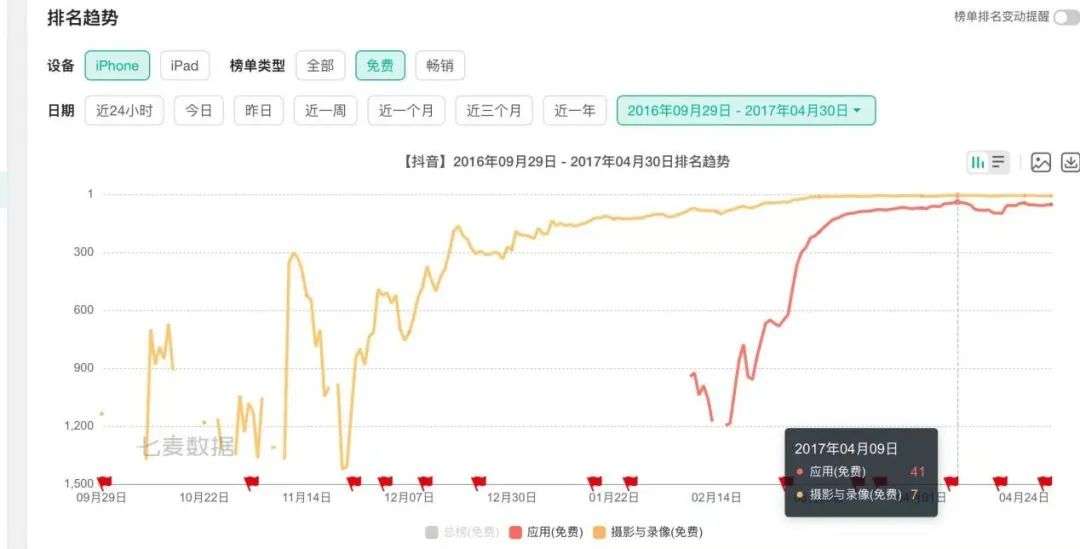 但仅半年之后,据七麦数据显示,2017年4月9日,抖音就进入了应用(免费)榜第41名,摄影与录像(免费)第7名,成为字节跳动新的战略级产品,证明算法推荐的战术在短视频领域依旧适用。