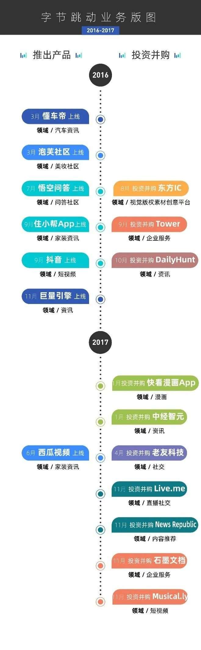 字节跳动也趁势向更多的领域进行扩张。2016年,字节跳动推出了多个赛道的产品,比如汽车资讯内容平台懂车帝、家装服务平台住小帮、电商购物APP值点、短视频资讯平台抖音、专注美妆分享的平台泡芙社区、企业沟通协作办公平台飞书、问答社区悟空问答等。