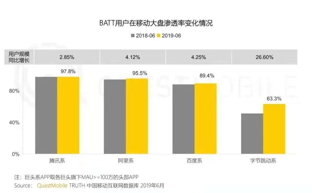 同时,字节跳动的月活用户规模同比增长超26.6%,增速远超BAT。从各个方面看,字节跳动此时已经有接近巨头的体量和依旧高速的增长,除了还没上市之外,称其为新巨头毫不为过。