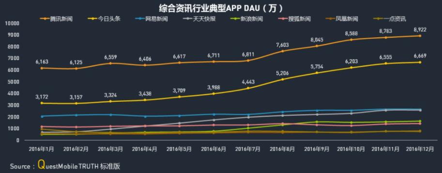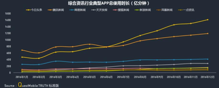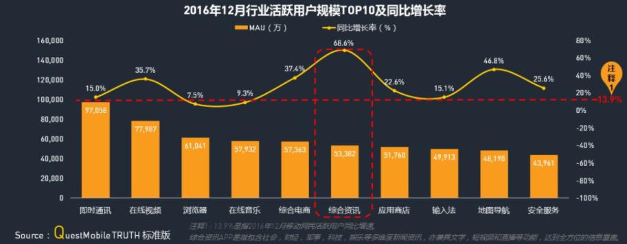 中国移动互联网大数据公司 QuestMobile 在回顾2016年时,将行业用户增长率最高的桂冠给到了综合资讯,MAU总量位居第六,但与第三到第五相差并不大。