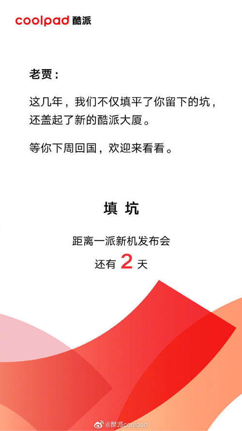 同时,酷派官微还附上一张海报,海报内容为,“老贾:这几年,我们不仅填平了你留下的坑,还盖起了新的酷派大厦。等你下周回国,欢迎来看看。”在我看来,酷派这波骚操作一举两得,既狠狠酸了贾跃亭一把,告诉众人当年被他坑惨了,又能蹭他热度来吸引各方关注。