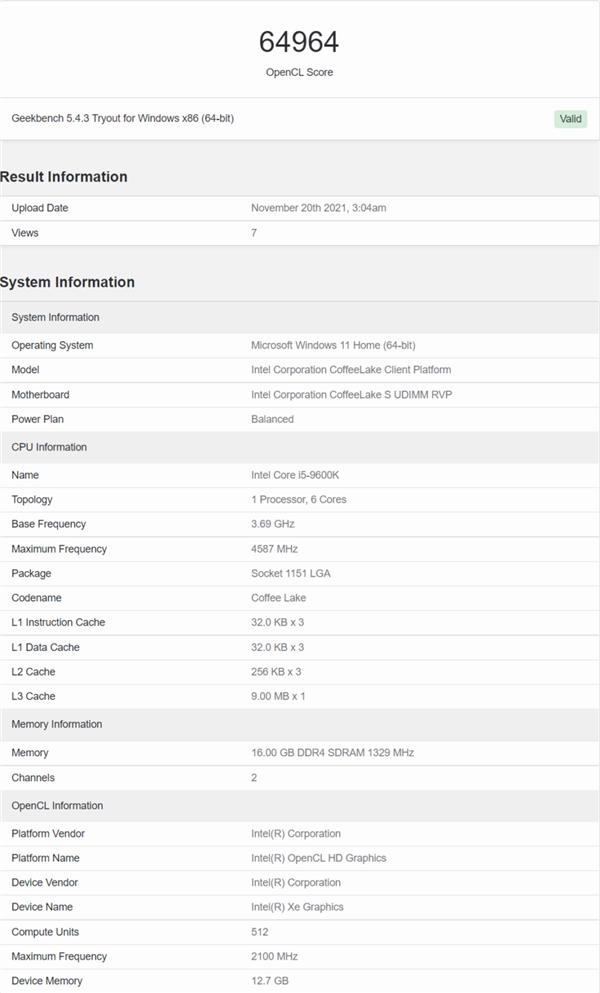 根据此前的爆料在我们能够了解到锐炫系列显卡基于Xe_HPG核心设计,核心设计共两种,分别拥有128和512组EU,其中的大核心最高可拥有4096颗流处理器。这颗大核心的实际性能就是大家最关心的事情,近日GeekBench OpenCL中就出现了型号为ARC 512的显卡跑分,处理器使用的则是i5-9600K。