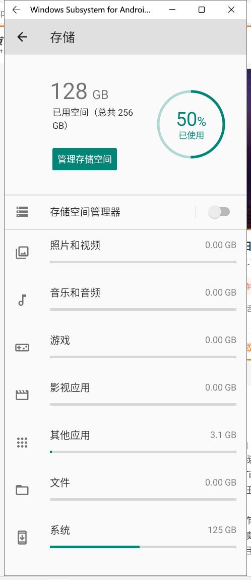 在这里可以发现,WSA 提供了 256GB 的虚拟存储空间 (非实际占用),存储空间满了也是要清理的。