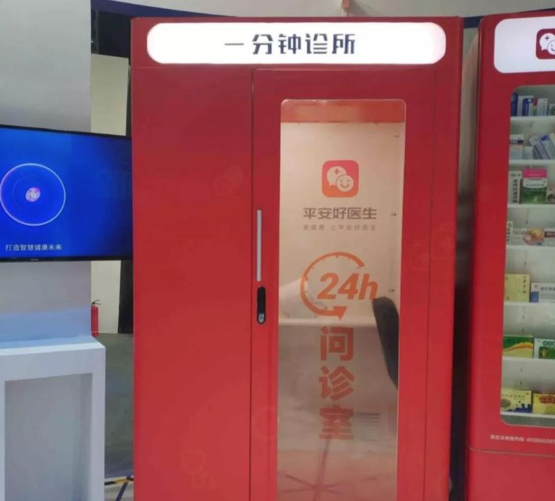 平安健康的一分钟诊所:占地不到3平方米,由智能药柜和医疗诊所两部分组成,可实现线上问诊、基础检测、开方、购药等一站式服务。在整个过程中,包括AI辅诊,同样提供医疗团队的远程会诊支持。问诊结束后,还可在旁边的智能药柜取药,获取上百种常见药品。