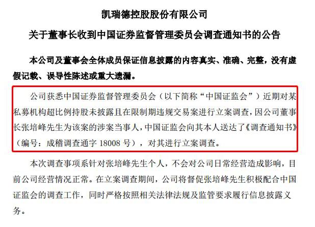 2018年7月21日,凯瑞德发布公告称, 公司董事长张培峰因涉嫌操纵证券市场 案分别在7月19日、7月18日被执行指定居所监视居住。在此之前,张培峰也辞去了公司董事长职务。