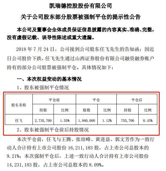 紧接着,凯瑞德发布公告,股东任飞部分股票被强制平仓。值得注意的是,任飞也是张培峰为了取得凯瑞德控股权增持的一致行动人。