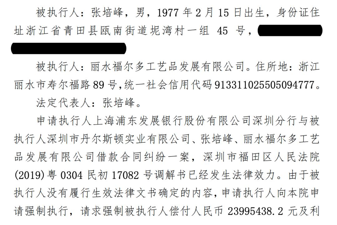 根据阿里拍卖平台信息显示,因与上海浦东发展银行股份有限公司深圳分行的借款合同纠纷一案,张培峰名下的深圳市南山区华侨城片区侨城东路锦绣花园一处房产被公开拍卖,但此次拍卖已流拍。