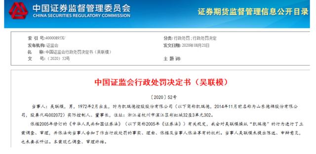 2020年9月,提携张培峰进入凯瑞德董事会的吴联模,遭证监会罚没5.13亿元,同时还被终身市场禁入。