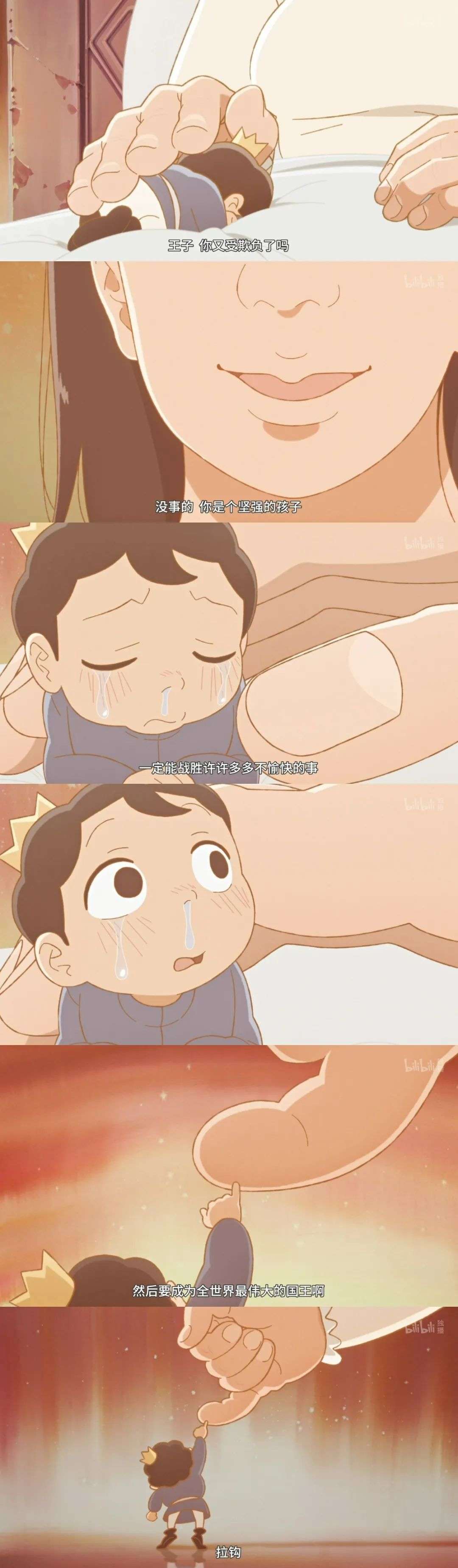 妈妈抚摸着哭泣的波吉王子,温柔地安慰他:“王子你又受欺负了吗?没事的,你是个坚强的孩子,一定能战胜许许多多不愉快的事,然后要成为全世界最伟大的国王啊”。