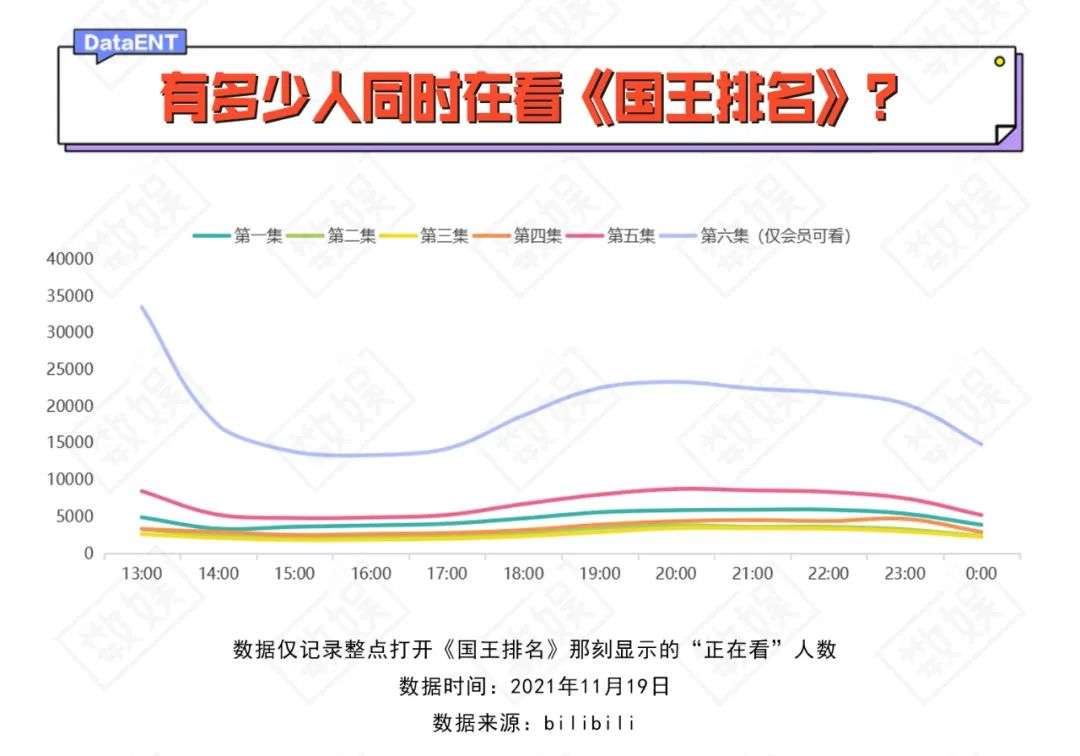 每到《国王排名》的更新日,百度搜索都会形成一个小高峰。数娱君在第六集更新日11月19日,统计了连续12个小时整点时刻同时“正在看”的人数,发现任意一集的每个时段都有超2000人,在只有会员能观看的集数也有超1万人的观看。