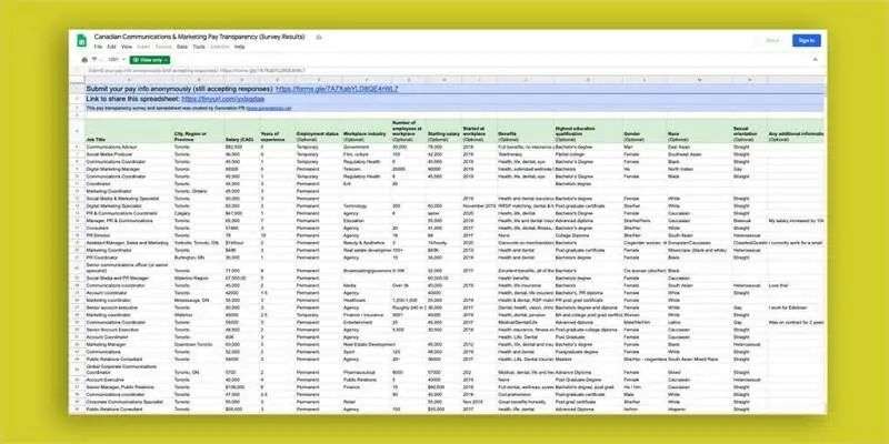 加拿大职业咨询公司Generation PR在2020年创建过一份公开的匿名电子表格,从事通讯和市场营销方向的职工,都可以在里面填入个人的薪酬资料。据Generation PR的文章介绍,匿名薪酬文件正流行起来,不同行业里都能看到这类文件,它们也正是倡导薪酬透明化的一个重要渠道。