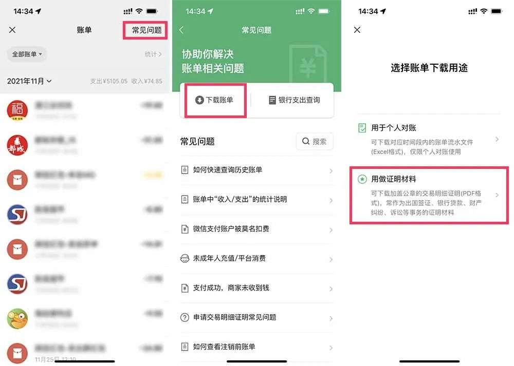 接下来,点击「常见问题」,选择「下载账单>用作证明材料」。