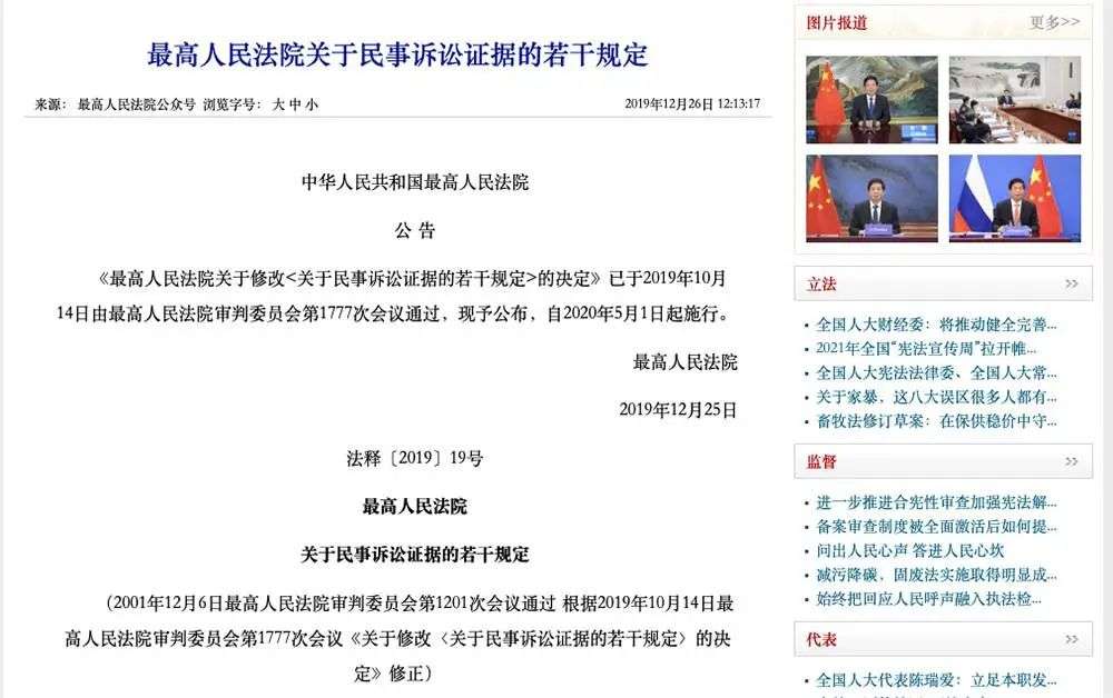 2019 年 12 月 26 日,最高人民法院发布了一则公告,宣布《最高人民法院关于修改<关于民事诉讼证据的若干规定>的决定》正式通过,并自 2020 年 5 月 1 日起施行。
