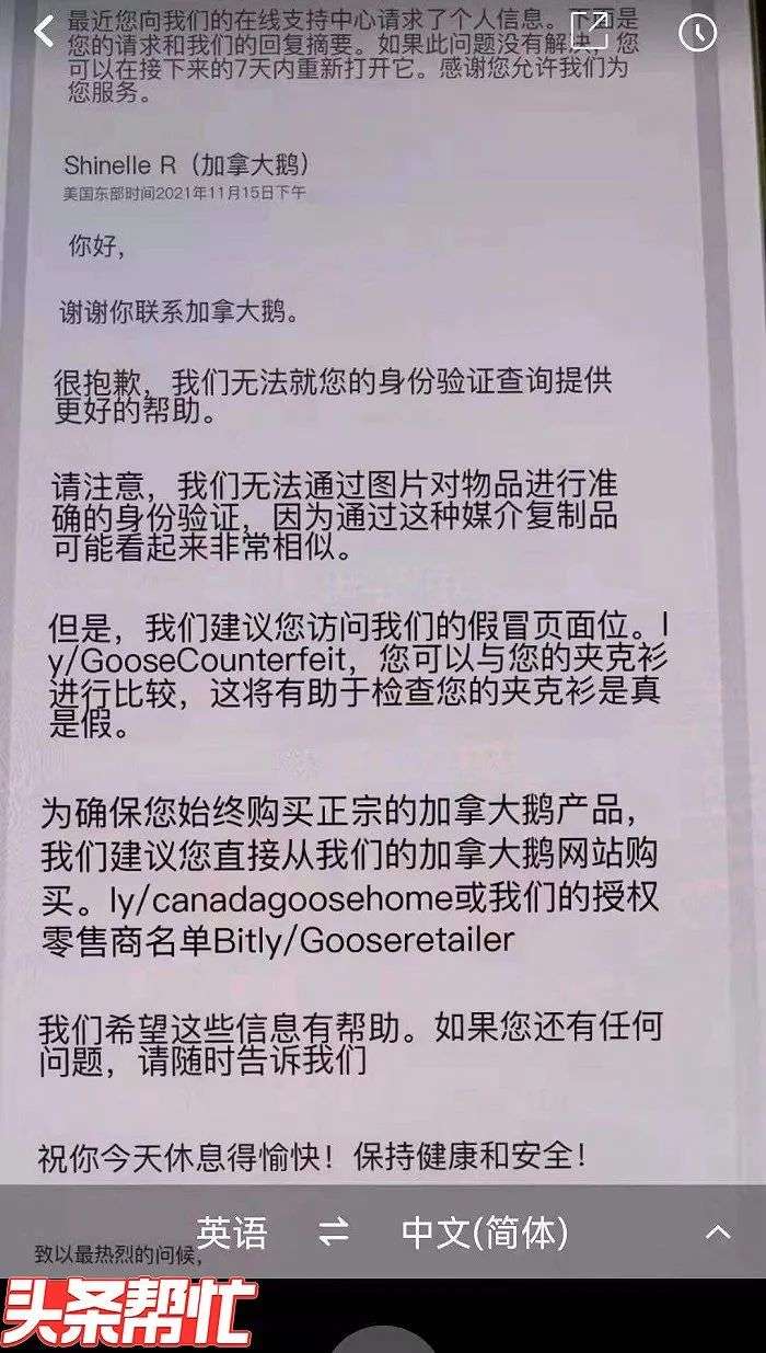11月30日,上海媒体“新民帮侬忙”接到投诉称,一位贾姓消费者在上海国金中心Canada Goose加拿大鹅专门店维权遭遇重重困难。