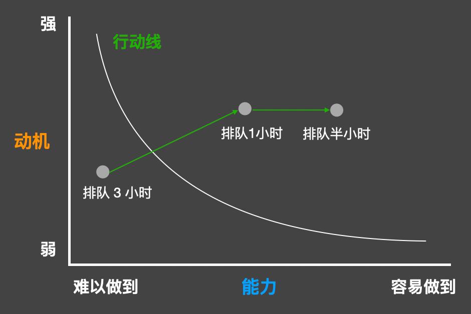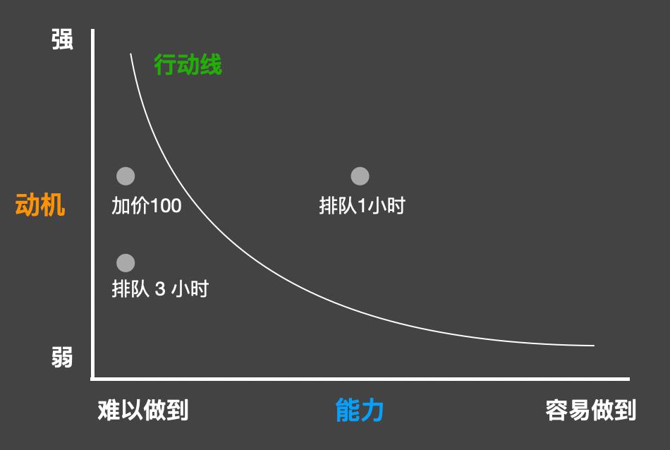 把这几个因素结合到福格行为模型中,你会发现加价 100 和排队 3 小时都会让用户行为难以发生。