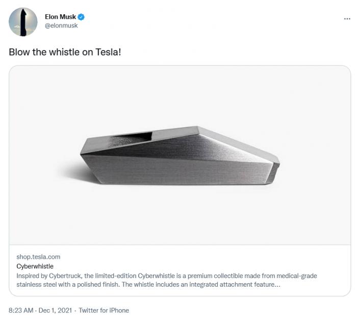 特斯拉CEO埃隆·马斯克于当地时间周二在Twitter上宣布了这款新Cyberwhistle,并邀请粉丝们“对特斯拉吹哨”。