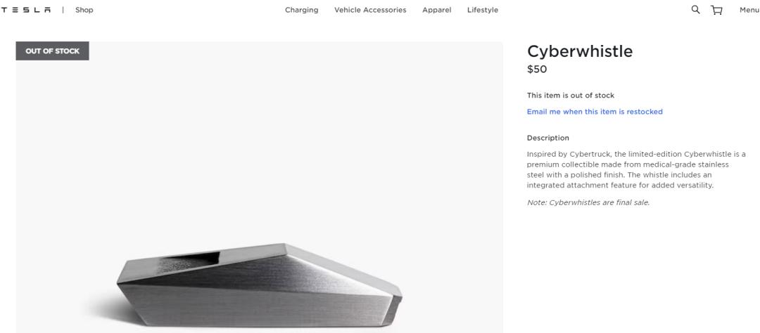 12月1日,特斯拉官网信息显示,特斯拉推出限量版赛博卡车造型哨子,售价每只50美元(约318元人民币)。