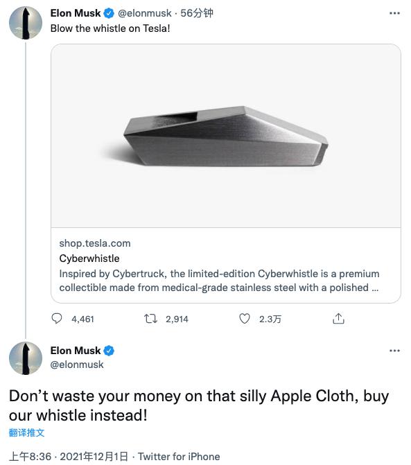 马斯克为该产品在Twitter卖力宣传,并表示“别给苹果抛光布交智商税,快来买特斯拉哨子吧!”