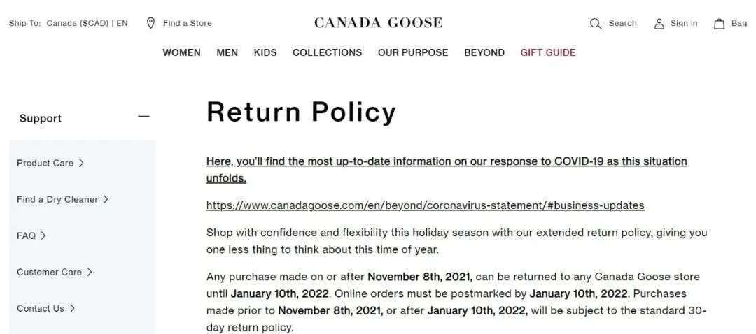 12月1日,新京报贝壳财经记者在加拿大鹅官方网站搜索时发现,其在加拿大、美国、英国地区均有30天退货政策。其加拿大官网显示,由于圣诞假期,在美国、加拿大、英国地区于2021年11月8日或之后购买的任何商品均可在2022年1月10日前退回至任何加拿大鹅店铺。这表明,近期其顾客享受多达33天的退货政策。此外,其加拿大官网还显示,在线订单必须在2022年1月10日之前邮寄出。在2021年11月8日之前或2022年1月10日之后购买的商品,仍将适用标准的30天退货政策。