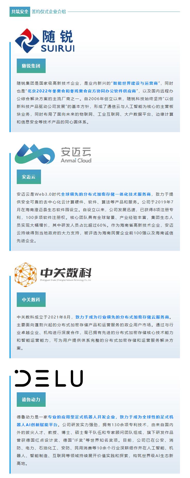 11月26日,随锐科技集团股份有限公司(以下简称“随锐集团”)、海南安迈云网络技术有限公司(以下简称“安迈云”)、中关数科(成都)网络技术有限公司(以下简称“中关数科”)在成都签订“共筑安全-三方战略合作协议”。协议达成后,三方将围绕去中心化(存储)技术共同研发,建立起通信安全与通信数据安全的新防线。同时,借助此次合作,三方还将形成行业解决方案,并进一步开拓全球市场。