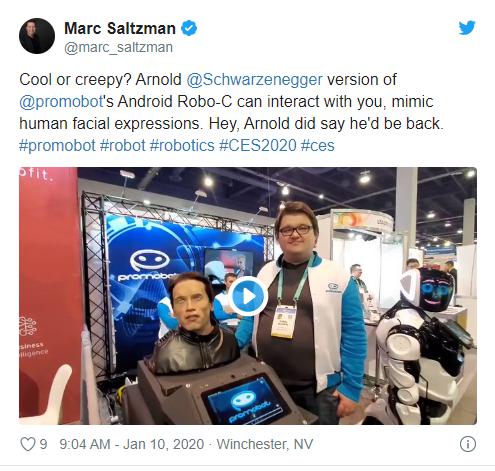 在 2020 年 CES 展会上,Promobot 推出了一款以施瓦辛格为原型的人形机器人,名为 Android Robo-C。这款机器人不仅会讲笑话,还可以回答诸如“世界上最大的国家是哪国?”、“你对人类的感觉如何?”之类的问题。不过,彼时的 Android Robo-C 并没有手臂,只有头部。