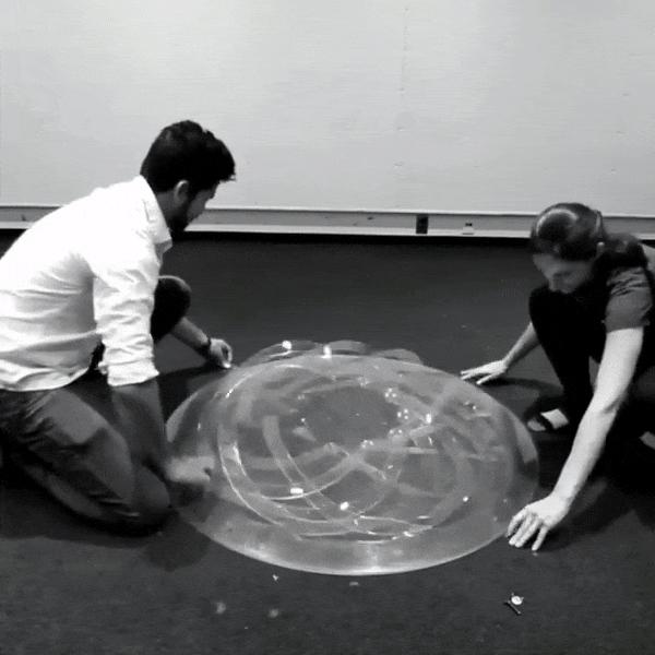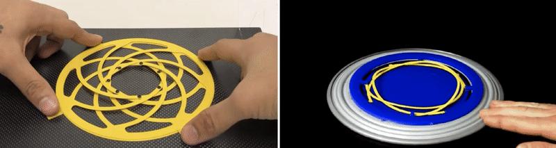 除了灯罩,另一件 Kiriform 结构的实验作品——圆形茶几也很有意思。两位研究人员用 1 秒时间就将一个圆形平板「转」成一张茶几,稍作固定反转过来就能用了。