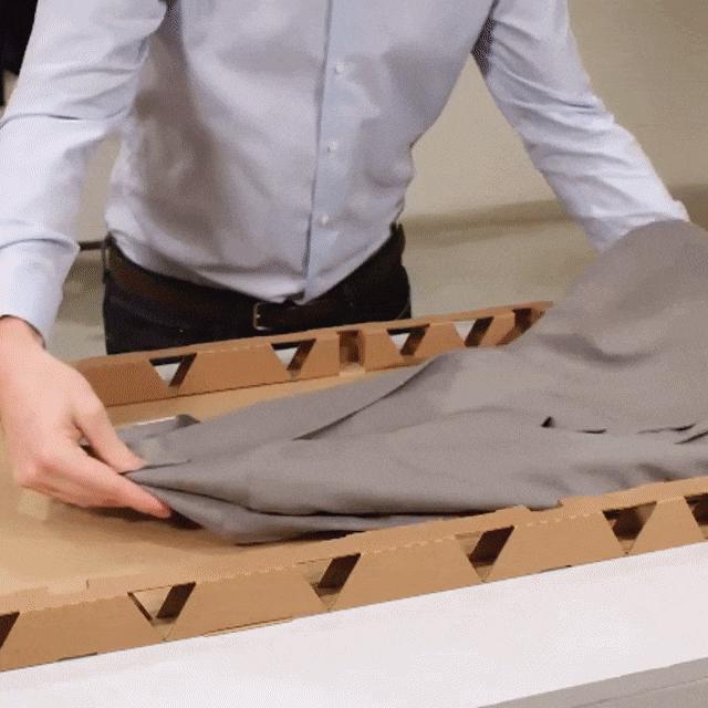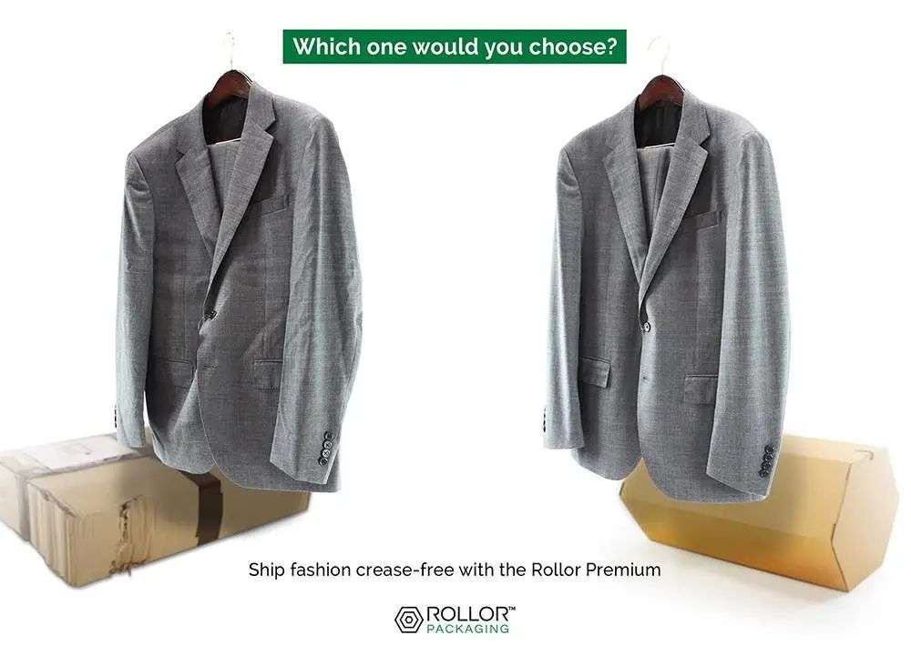 ▲用普通纸箱包装的西装(图左)和用 Rollor Packaging 卷筒式包装盒装的西装(图右). 图片来自:Facebook @Rollor Packaging
