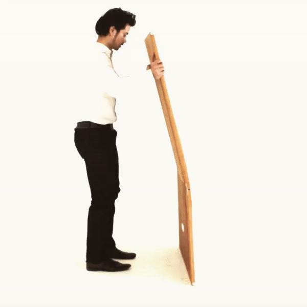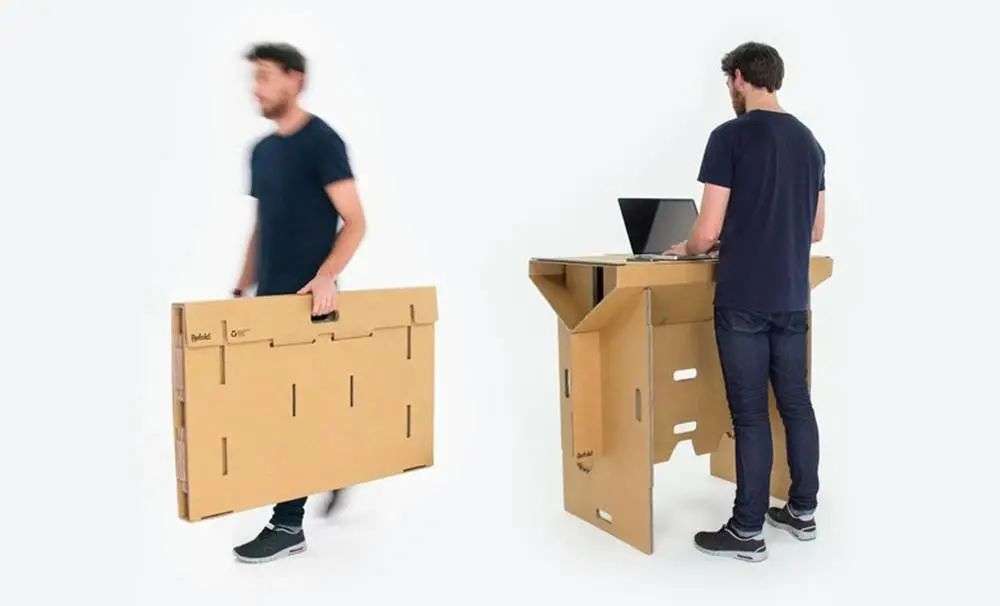 重量仅有 6.5 公斤的便携办公桌,展开之前便是单手即可拿起的纸版,可是展开成为办公桌后,可以承载一个成年男性的体重。自称 85 公斤的设计师 Fraser Callaway 曾亲自上场,站到桌子上进行质量检测。