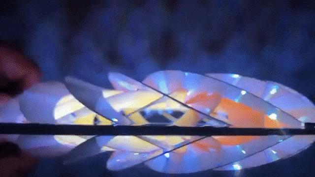 不过当 Kiriform 结构应用的灯罩闭合,让人惊叹的事情发生了——刚刚还有点像电风扇的灯罩瞬间变成了一块毫无凹凸起伏的平板,将灯光紧紧地关在了里面——即使里面的灯仍旧亮着,外面也已经陷入一片黑暗。