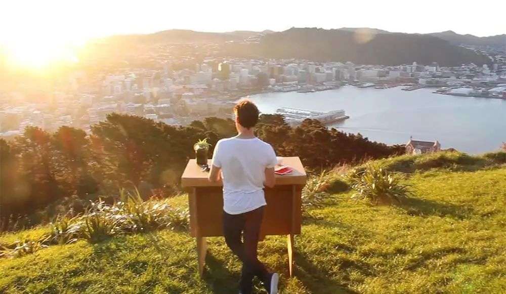 ▲设计师 Fraser Callaway 在测试办公桌. 图片来自:New Atlas