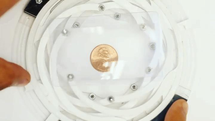 哈佛研究团队还将相机放大聚焦的原理用在 Kiriform 结构上——在镜片下放置一枚硬币,当 Kiriform 结构因为旋转而改变,固定在结构上的镜片也会让硬币的影像在清晰度和大小上快速调试。