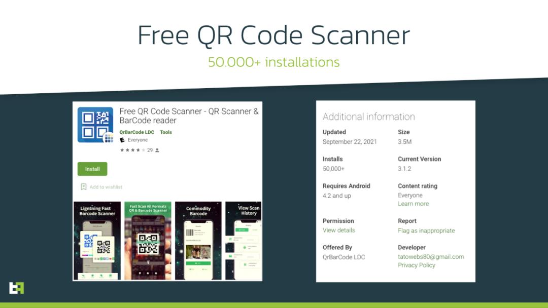 经 ThreatFabric 分析,共有 6 款恶意软件在分发 Anatsa 木马。为了欺骗用户下载,它们分别伪装成二维码扫描仪、PDF 扫描仪和加密货币 App,其中光一个二维码扫描仪下载量就高达 5 万次,甚至为了引诱人们下载,攻击者还雇人刷好评,该 App 下载页面上多为正面评价 。