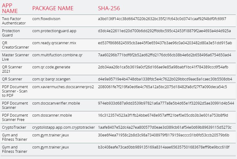 以下为 ThreatFabric 发现暗藏以上四类 Android 银行木马的 12 款恶意软件: