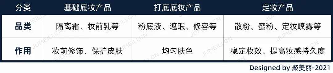 按照功能区分,底妆产品可分为三大类:基础底妆产品、打底底妆产品、定妆产品。