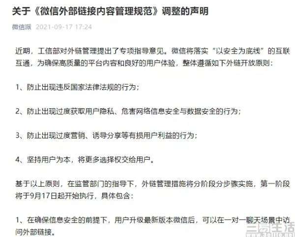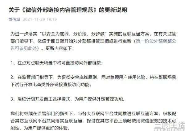 11月29日,微信发布《关于〈微信外部链接内容管理规范〉的更新声明》,宣布点对点聊天场景中将可直接访问外部链接,并将在群聊场景试行开放电商类外部链接直接访问的功能。根据实测显示,在微信群聊场景下已经能够直接打开访问电商类外部链接,例如淘宝等网址已不再需要复制到浏览器后跳转打开。