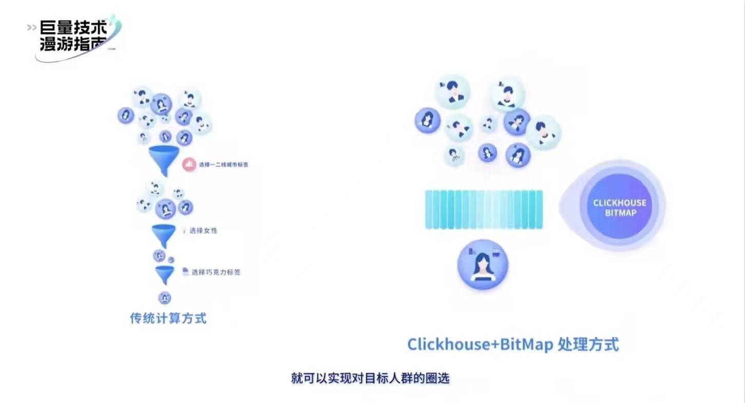 例如广告主想对一二线城市爱吃巧克力的女性进行内容分析,传统的数据库则需要读取所有数据才能依次筛选出一二线城市、女性、爱吃巧克力三个标签,最后三个条件都符合的才是广告主的目标人群。但如果使用ClickHouse这个“外援”,系统无需读取全部数据,只需查询这三个标签所在的“列”,再对这三组数据在用户分片上进行“交并差”并行处理就可以了,大大节省了查询时间。