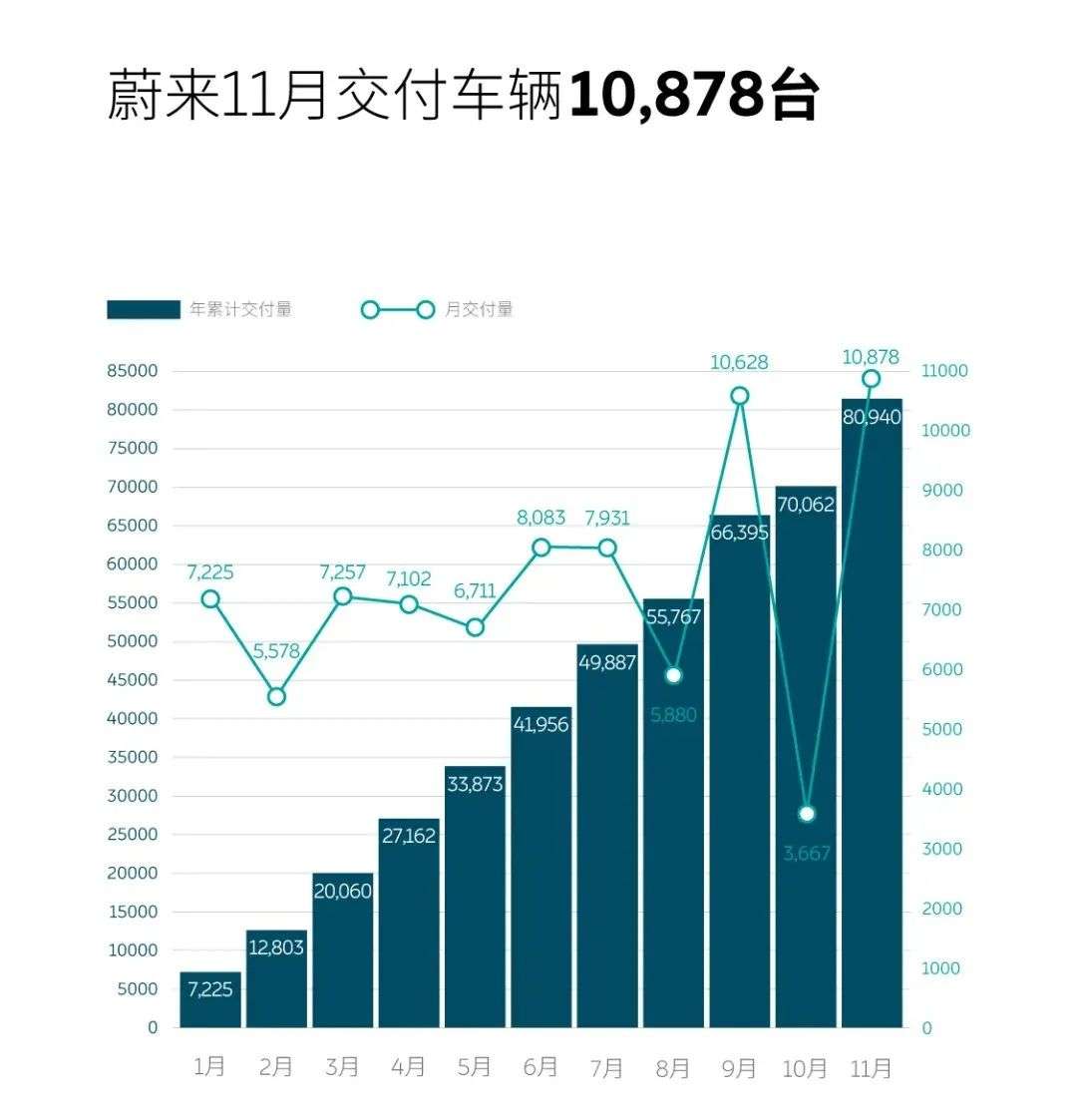 今天,蔚来的销量还真的回到了正轨,11月卖了10878辆车,同比增长105.6%。但蔚来的交付量波动极大,忽高忽低,这一事实无法忽略,12月可能又会被打回原形。