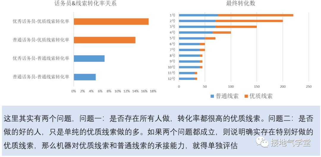 如果有些线索就是天然的转化好,有些怎么做都不行,那么就得考虑:天然好,是因为线索本身就容易转化,还是话务员服务很得心应手。到底机器人能不能承接住这些线索。(如下图)
