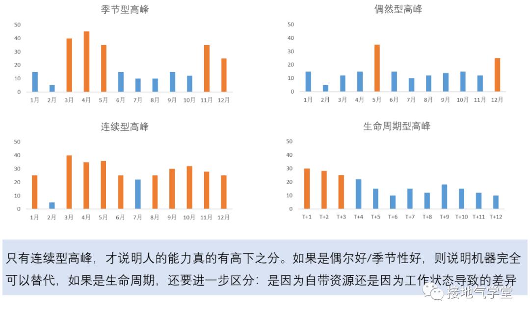 但是,只考虑短期(比如一个月)的表现,并不公平,很有可能一个话务员一直表现很好,只是最近一个月没有表现好。所以做分层的同时,还要加入行为分析,判断:话务员是持续好、一开始好、越来越好,还是真的随机好(如下图)。